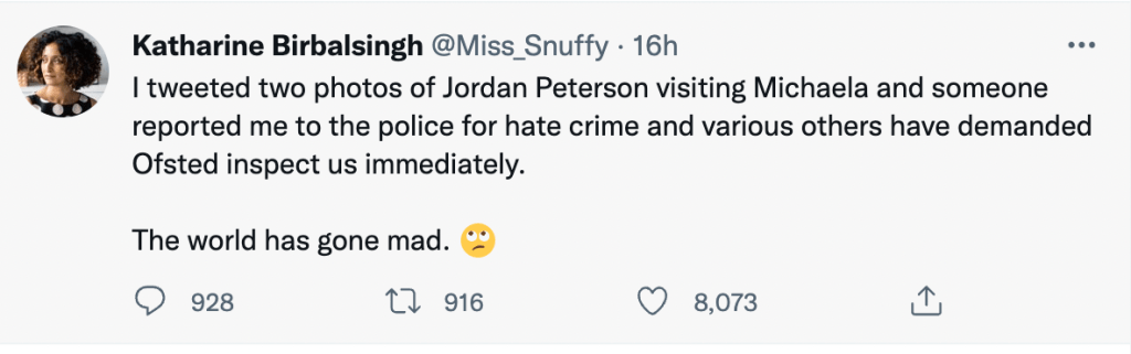 Jordan Peterson visited a school last week. The headteacher was reported to the police for hate crime, as well as being reported to Ofsted for ‘breaching safeguarding’. More ammunition for Piers Morgan to bemoan cancel culture.