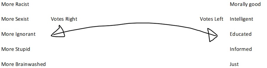 Secondly, you’re revealing what you actually think about people and politics – and it’s part of the reason the left often loses. You think you’re better than those people who vote for populists. In some left-leaning minds there is a spectrum like this: