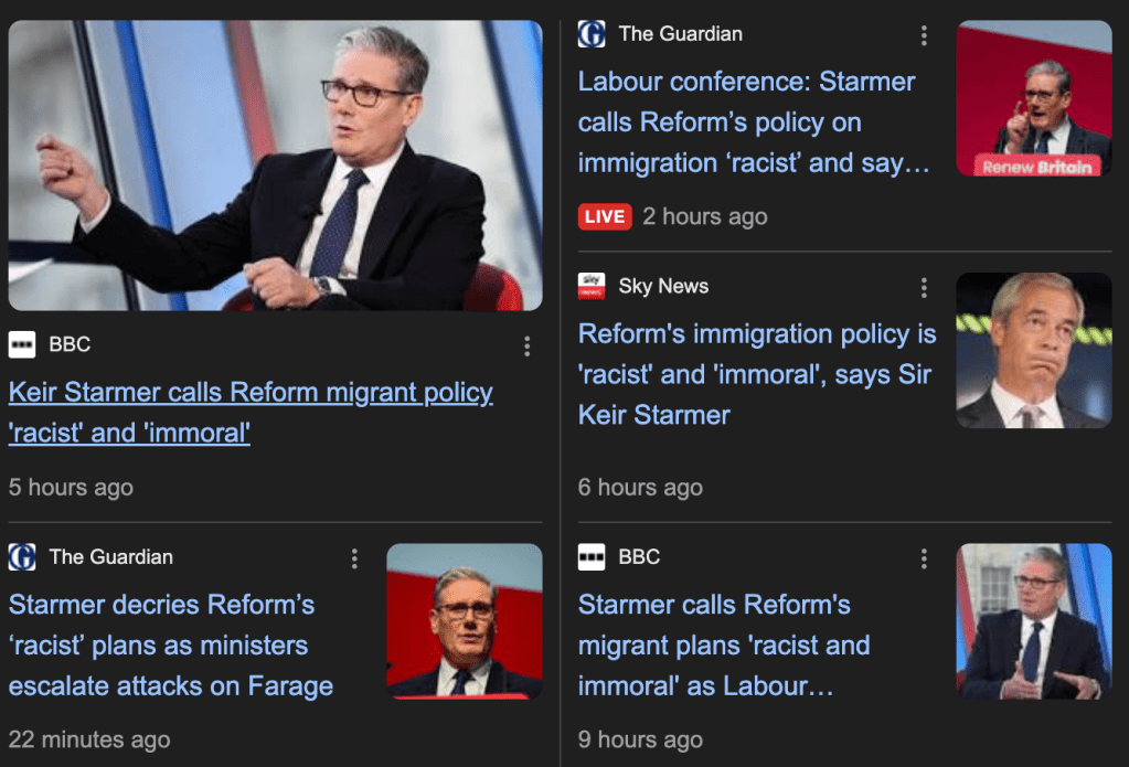 Off-handedly labelling Reform or it’s policies ‘racist’ will only drive many decent, actually unbigotted, swing voters who may be currently toying with the idea of voting Reform further into their arms. By using the racist label too freely you also give political cover to actual racists. Just ask Gordon Brown and David Cameron. How did that strategy go over the last 20 years? Oh don’t believe me? How about we ask the far-right about their popularity right now?